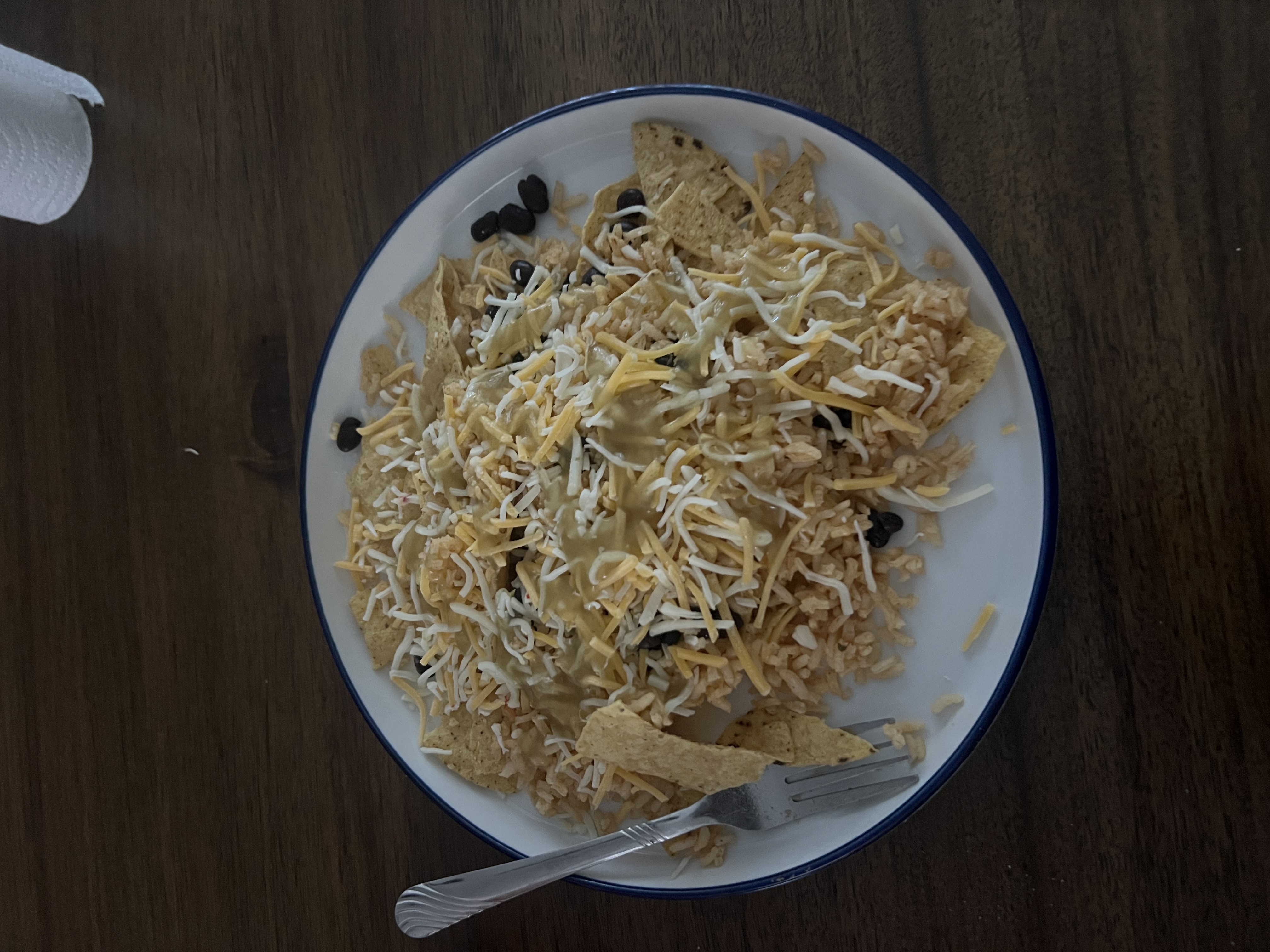 lunch was nachos with rice, beans, cheese, and salsa verde. unfortunately, we ran out of nacho cheese. oh well.