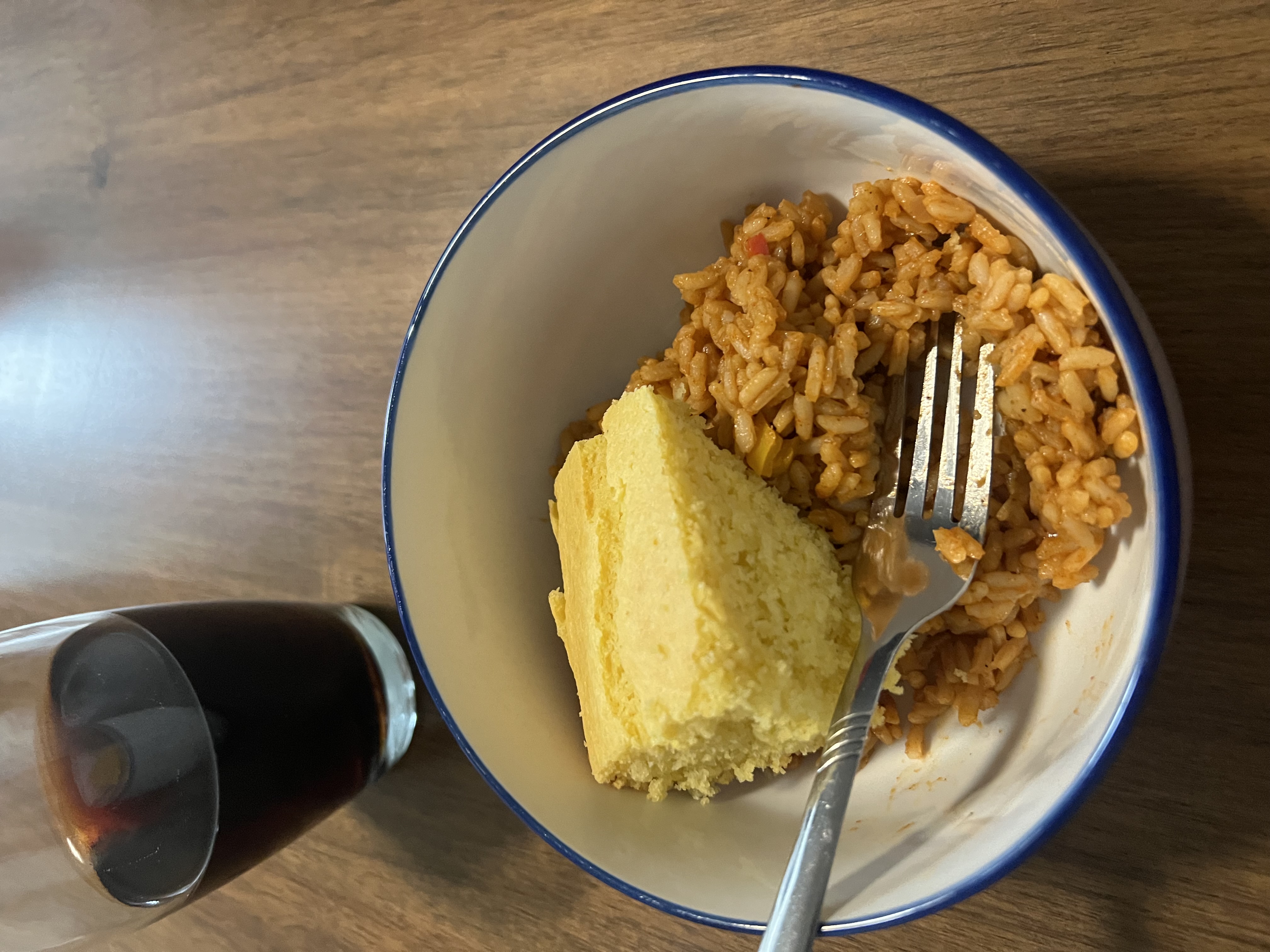 dinner was jambalaya and cornbread. i really love cornbread, so i had two slices. i also drank dr. pepper. :)